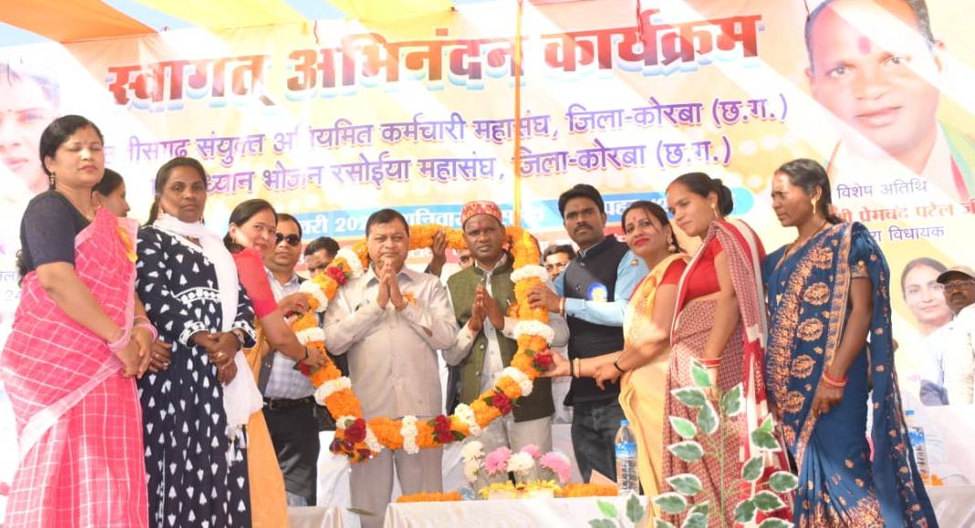 रायपुर छत्तीसगढ़ संयुक्त अनियमित कर्मचारी महासंघ व मध्यान्ह भोजन रसोइया महासंघ के संयुक्त तत्वाधान में आज कोरबा के घंटाघर में उद्योग और श्रम मंत्री लखन लाल देवांगन का सम्मान और अभिनंदन किया गया ।