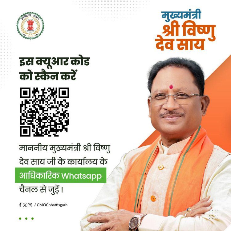 रायपुर। मुख्यमंत्री विष्णुदेव साय के अधिकारिक वाट्सअप पर अब सरकार की ताजा तरीन और पल-पल की खबरें नियमित रुप से पाठकों के लिए उपलब्ध रहेंगी। इस वाट्सअप पर पाठक सीधे तौर पर मुख्यमंत्री से जुड़ सकते हैं और उनका अधिकृत वाट्सअप आज छत्तीसगढ़ जनसंपर्क विभाग द्वारा जारी किया गया जिसका क्यूआर कोड स्कैन करने के बाद उन्हें शासन की खबरों से रूबरू हो सकेंगे।