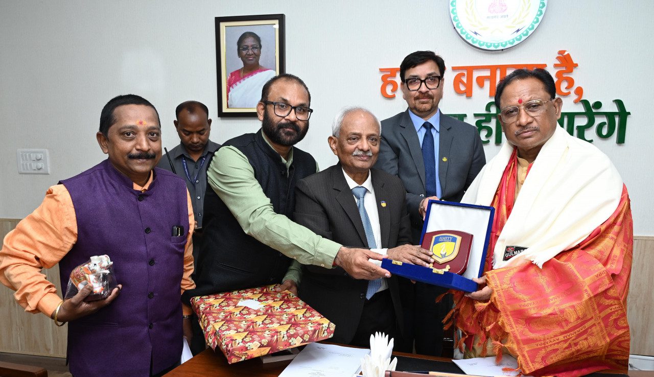 रायपुर मुख्यमंत्री श्री विष्णु देव साय से आज यहाँ उनके निवास कार्यालय में एमिटी विश्वविद्यालय के कुलाधिपति डॉ. डब्ल्यू. सेल्वामूर्ति एवं कुलपति डॉ. पीयूष कांत पांडेय ने सौजन्य मुलाकात की। उन्होंने मुख्यमंत्री श्री साय को शाल एवं प्रतीक चिन्ह भेंट कर सम्मानित किया। इस अवसर पर डॉ. अरुण पटनायक भी उपस्थित थे।