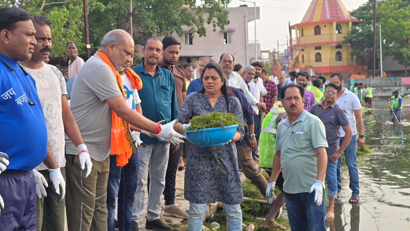 निगम क्षेत्र में तालाब को संवारने पहली बार इतने सारे लोग एकत्र हुए थे। स्वेच्छा से दुर्ग ग्रामीण विधायक ललित चंद्राकर व आयुक्त मोनिका वर्मा ने काटा लेकर घाट के आस पास उगे जलीय पौध को निकाला। वहीं पार्षद विधि यादव ने तालाब के भीतर 4 फीट गहराई से जलीय पौध को निकालकर सफाई की।