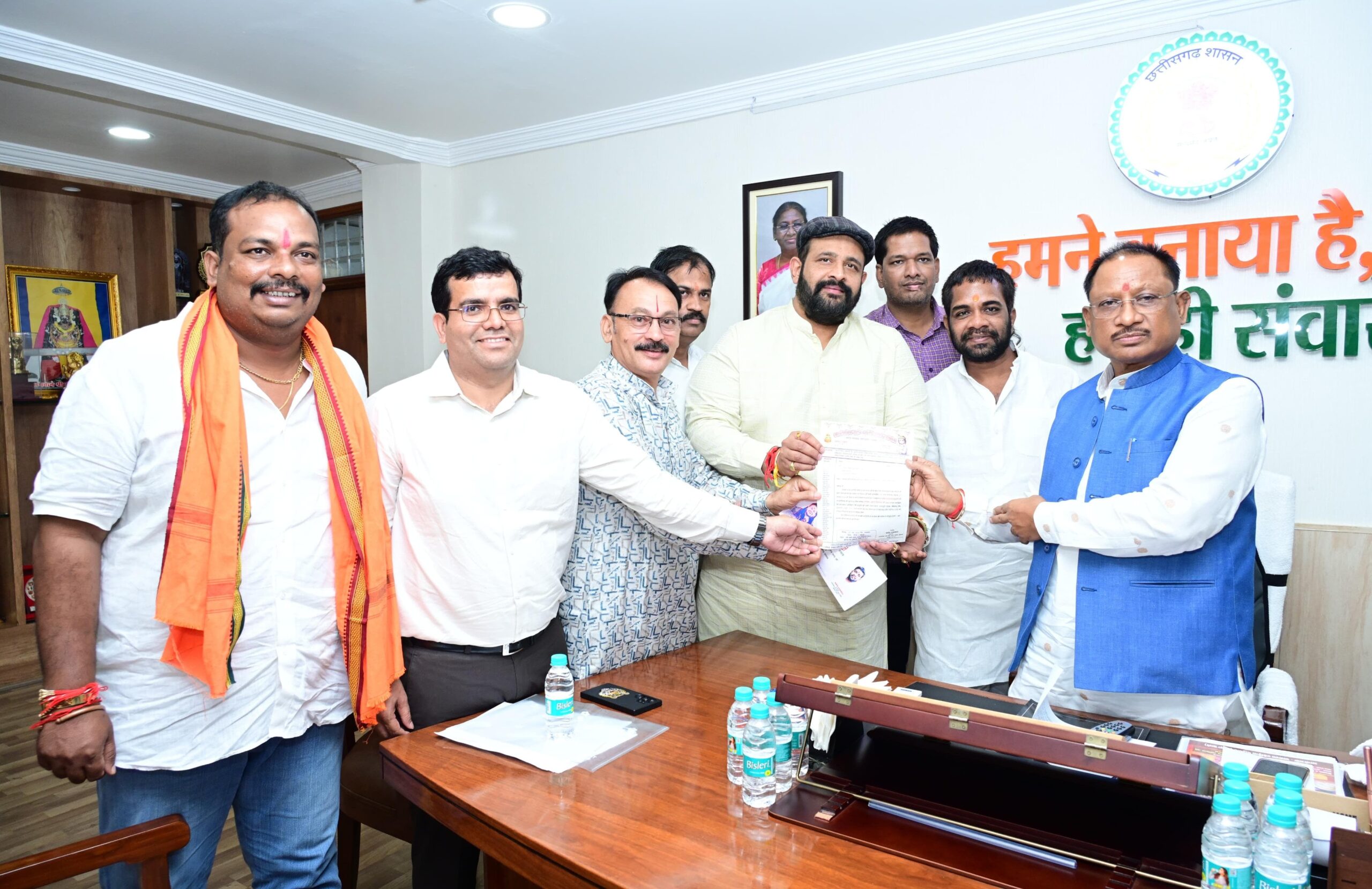 रायपुर  मुख्यमंत्री श्री विष्णु देव साय से आज यहाँ उनके निवास कार्यालय में सार्वजनिक दही हांडी उत्सव समिति गुढियारी, रायपुर के पदाधिकारियों एवं सदस्यों ने सौजन्य मुलाकात की। उन्होंने मुख्यमंत्री को भगवान श्री कृष्ण जन्मोत्सव के अवसर पर 27 अगस्त को आयोजित दही हांडी उत्सव प्रतियोगिता में शामिल होने के लिए आमंत्रित किया। मुख्यमंत्री श्री साय ने आमंत्रण के लिए समिति के सदस्यों को धन्यवाद दिया। इस अवसर पर श्री प्रबल प्रताप सिंह जूदेव, संयोजक श्री बसंत अग्रवाल, सह-संयोजक श्री हेमेंद्र साहू एवं पदाधिकारीगण उपस्थित थे।
