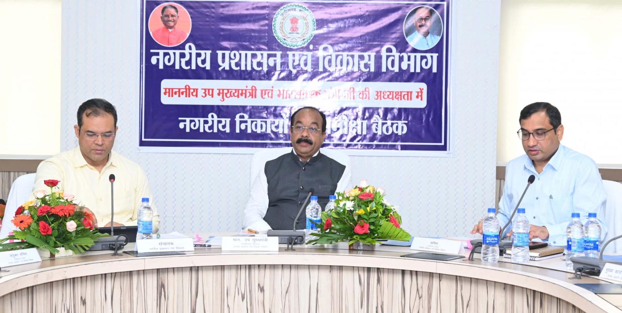रायपुर उप मुख्यमंत्री तथा नगरीय प्रशासन एवं विकास मंत्री श्री अरुण साव ने आज मंत्रालय में वरिष्ठ विभागीय अधिकारियों के साथ राज्य के सभी नगर निगमों और नगर पालिकाओं के कार्यों की समीक्षा की। उन्होंने बैठक में सभी आयुक्तों और मुख्य नगर पालिका अधिकारियों को शहरों के विकास और जन सुविधाएं विकसित करने गंभीरता से काम करने के निर्देश दिए। उन्होंने कहा कि किसी भी नगरीय निकाय में काम में कोताही बर्दाश्त नहीं की जाएगी। सभी अधिकारी मुस्तैदी से अपने दायित्वों का निर्वहन कर शहरों का सुव्यवस्थित और सुनियोजित विकास सुनिश्चित करें। नगरीय प्रशासन विभाग के सचिव डॉ. बसवराजु एस. और संचालक श्री कुंदन कुमार भी समीक्षा बैठक में शामिल हुए।