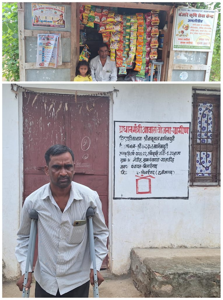 सारंगढ़ बिलाईगढ़ जिले के सरसीवां तहसील के ग्राम पंचायत गाताडीह के आश्रित ग्राम अमलीडीह निवासी दिव्यांग श्री बाबूलाल मानिकपुरी अपने बातों का उच्चारण सही ढंग से नहीं कर पाते। परन्तु राज्य सरकार ने आवास की मांग, जरूरत को समझा और पीएम आवास योजना ग्रामीण से उनको लाभ दिया। दिव्यांग श्री बाबूलाल के लिए पीएम आवास केंद्र और राज्य सरकार का बड़ा सहयोग है। सरकार के सहयोग से उनके लिए उनका पीएम आवास बना है जिससे वे संतुष्ट हैं। श्री बाबूलाल बताया कि वर्ष 2007 के आसपास ओंकारेश्वर मध्यप्रदेश के जेपी कंपनी में वे श्रमिक का काम करते थे, तब उनके पैर में कैंसर हो गया, जिनकी वजह से उनके पैर को काटना पड़ा और वह सामान्य से दिव्यांग हो गए। उनके घर में उनकी पत्नी और दो बेटियां हैं। अमलीडीह गांव की बस्ती में पुराने घर में वे रहते थे। अब वह अपने नए घर में रहने लगे। घर के पास एक छोटे से ठेला में कुरकुरे बिस्किट आदि बिक्री कर अपनी आजीविका चलाते हैं। यदि सरकार उनके आवास के लिए सहयोग नहीं करते तो उनके जीवन में आवास की समस्या बनी रहती।